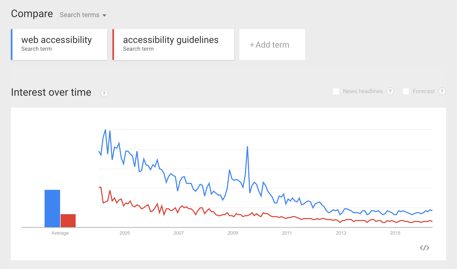 (Image: Google Trends graph of web accessibility and guidelines over time, captured May 16, 2016)